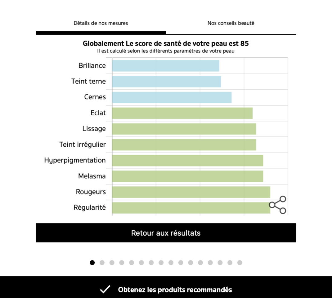 Découvrez vos résultats personnalisés et le score santé de votre peau grâce aux détails de nos différentes mesures : Eclat, homogénéité du teint, cernes, brillance, imperfections…